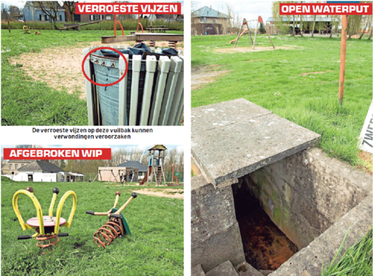 De speelpleintjes in de Urnestraat in Velzeke en aan de kerk in Erwetegem liggen bezaaid met huisvuil en houtafval maar het gevaarlijkst is het op het speelpleintje, of wat daar nog van overschiet, in Oombergen. De schommel kan nog door de beugel en ook de wip ziet er veilig uit maar wie de glijbaan afwil, trekt maar best een dikke lange broek aan, want je zou wel eens een lelijke schaafwonde kunnen oplopen door het gat halfweg de glijbaan. Een spelletje petanque spelen terwijl je kinderen zich amuseren, lukt daar ook niet meer want de twee petanqueterreinen liggen er verloederd bij en zijn overwoekerd met onkruid. Plots vallen onze ogen er op een open riool. Via een trap beland je ondergronds waar je in een waterput dreigt te vallen. Die is er volgens omwonenden altijd al geweest en nog nooit is er een ongeval gebeurd. Maar daar zitten ouders uiteraard niet op te wachten alvorens de riool wordt afgesloten.